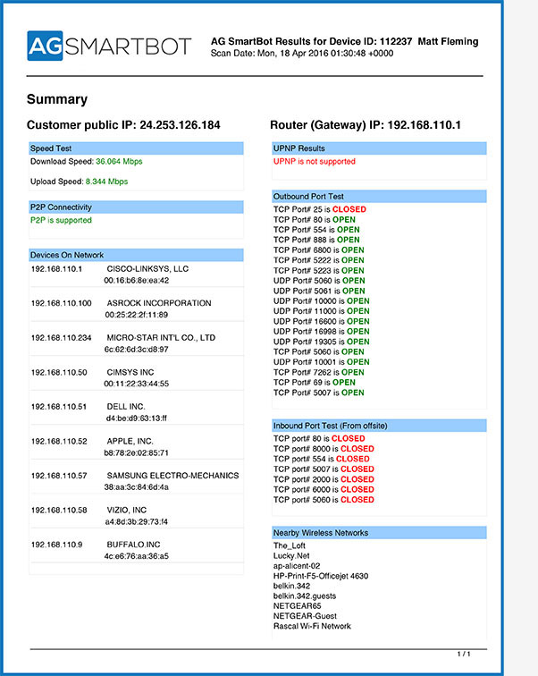 Identifies all devices currently connected to your client's network which helps installers identify unused and non-automatically assigned IP addresses prior to installation. This can help prevent return visits and maintenance plan claims due to conflicts that interfere with the use of other devices, such as printers, on the client's network.6. UPNP Results